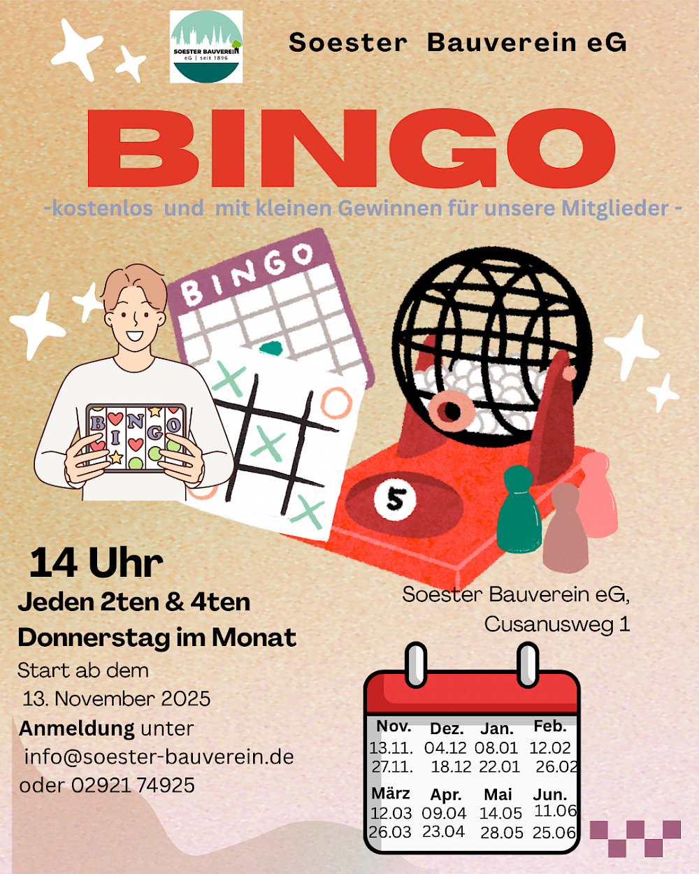 Für unsere Mitglieder sowie Bewohnerinnen u. Bewohner bieten wir ab November 2025 einen Bingo-Nachmittag an!