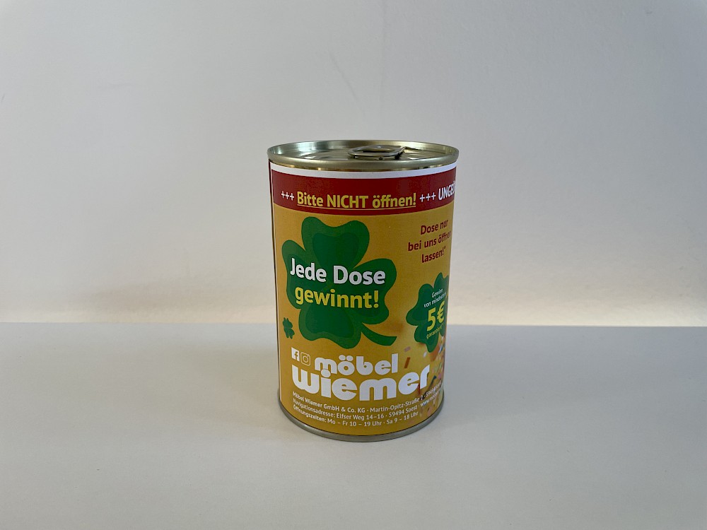 Jede Dose gewinnt - sie muss am 27.02.2026 oder 28.02.2026 in geschlossenem! Zustand von Möbel Wiemer geöffnet werden. Jede Person darf nur eine! Dose abgeben.