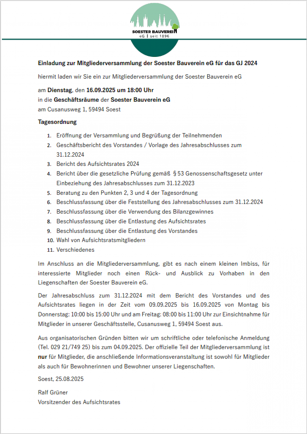 29.08.2025Einladung zur Mitgliederversammlung für das GJ 2024Details entnehmen Sie bitte der beigefügten Einladung!
